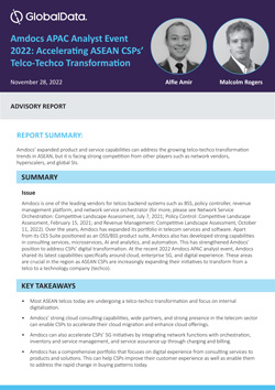 This advisory report from GlobalData details Amdocs latest capabilities around cloud, enterprise 5G, and digital experience shared at the recent Amdocs APAC analyst event. These areas are crucial in the region as ASEAN CSPs are increasingly expanding their initiatives to transform from a telco to a technology company (techco). The key takeaways described in the report include: